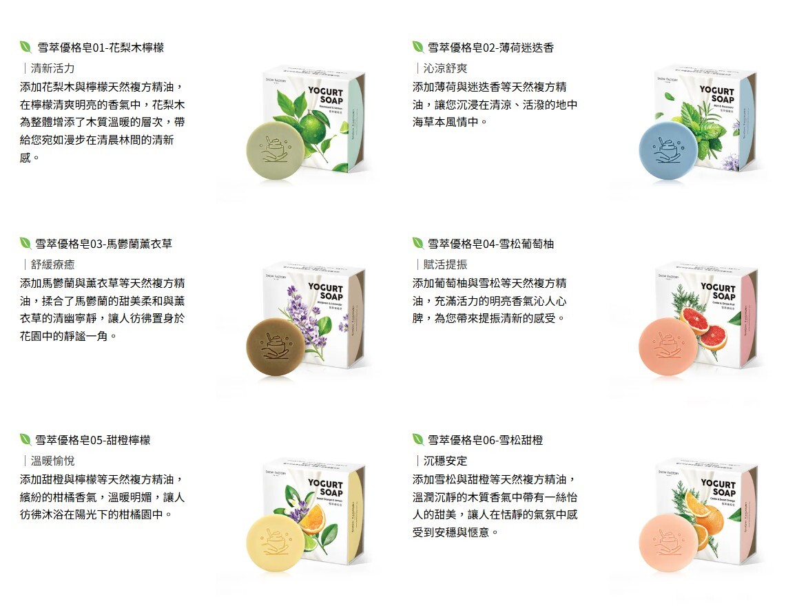 ● 將自家無塵室製作的頂級鮮奶優格,以低溫凍成優格冰再入皂,優格的乳成分及乳酸帶來溫和的洗感,為肌膚帶來最溫柔的守護。