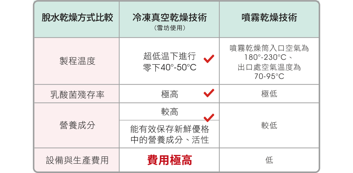 冷凍真空乾燥技術可以將新鮮優格的活菌和營養成份保留下來,雖然成本極為高昂,為了給客人最優質的優格益生菌,我們認為這是值得的。